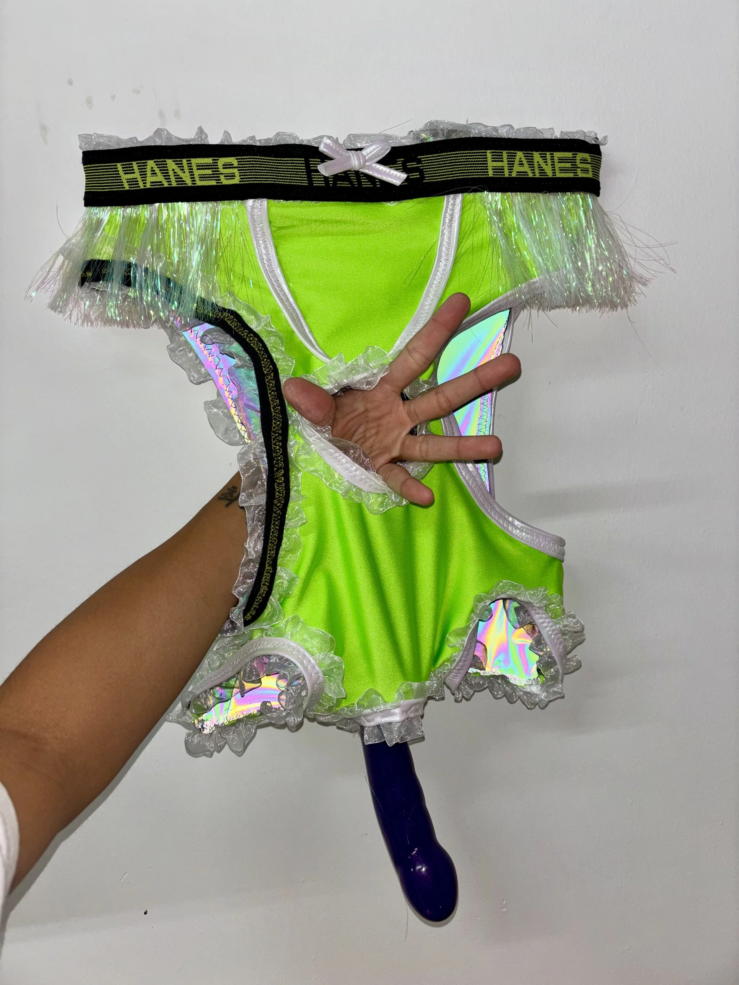 Spandex xoxo reflective fabric xoxo elastic band xoxo lace ribbon xoxo iridescent fringe trim xoxo my ex’s boxer briefs xoxo 6 inch purple dildo <3