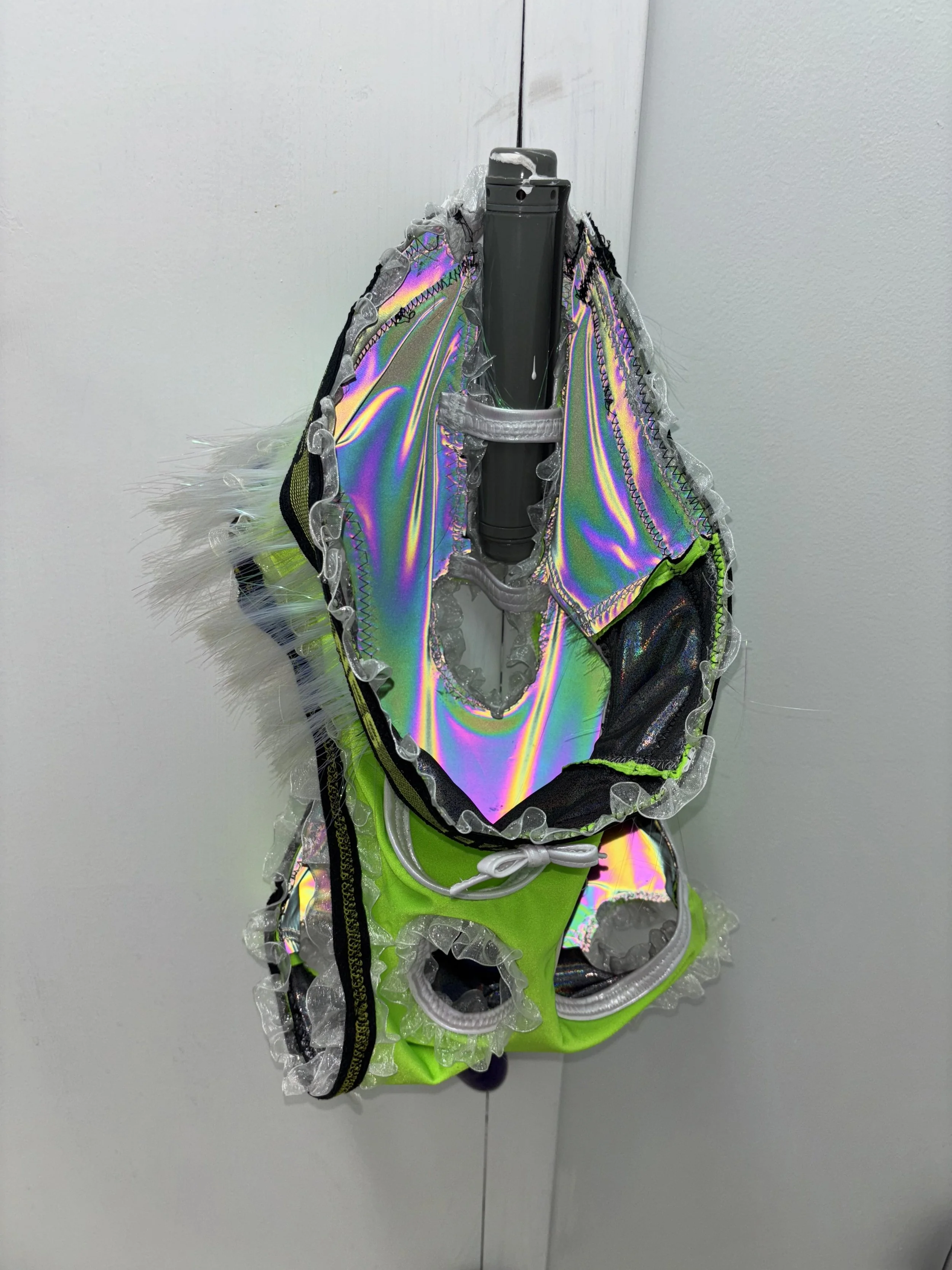 Vinyl, lace, ribbon, plastic boning, zipper, aluminum wire, sunglasses, buttons